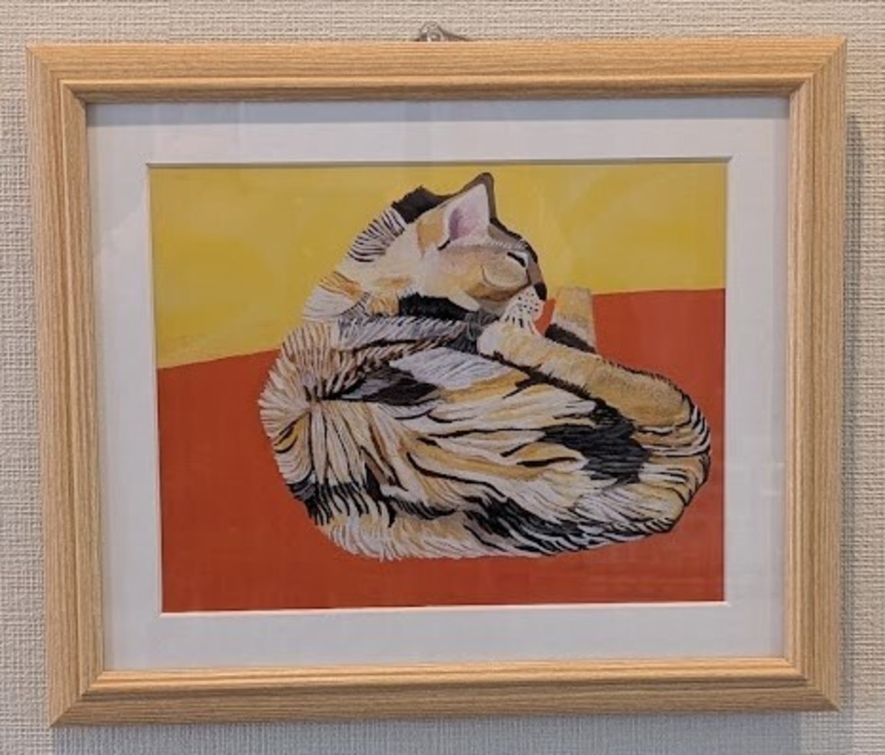 *この作品『猫の昼寝』は、猫のように自由気ままにを表現したく、明るい黄色でまとめています。見ているだけでリラックスできるような安心感を与えてくれることでしょう。この作品は、心の平和を感じさせ、毎日の疲れを癒してくれるお供となること間違いなしです。こちらの作品の原画は2024年第4回世界ねこアートコンクールにて賞候補作品に選ばれました。1枚目の写真は前画板:ガラスを外して照明をつけて撮影し、2枚目は照明をつけて前画板:ガラスをつけて飾った時の写真を添付しています。(少し反射して見えるかもしれません)